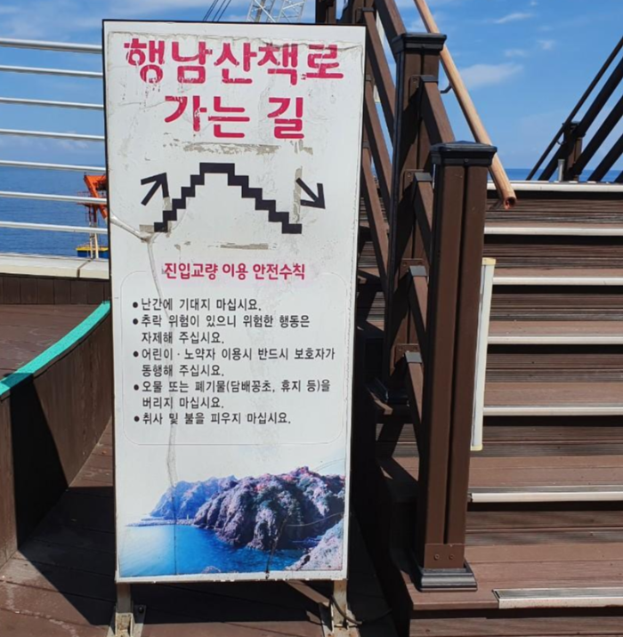 행남 산책로 가는 길입니다. 난간에 기대지말고 추락위험이 있으니 위험한 행동은 자제해달라는 진입교량 이용 안전수칙이 적혀있습니다. 산책로 첫머리는 도동항 여객선터미널 4층 이 길로 내려가면 해안 산책로가 나옵니다