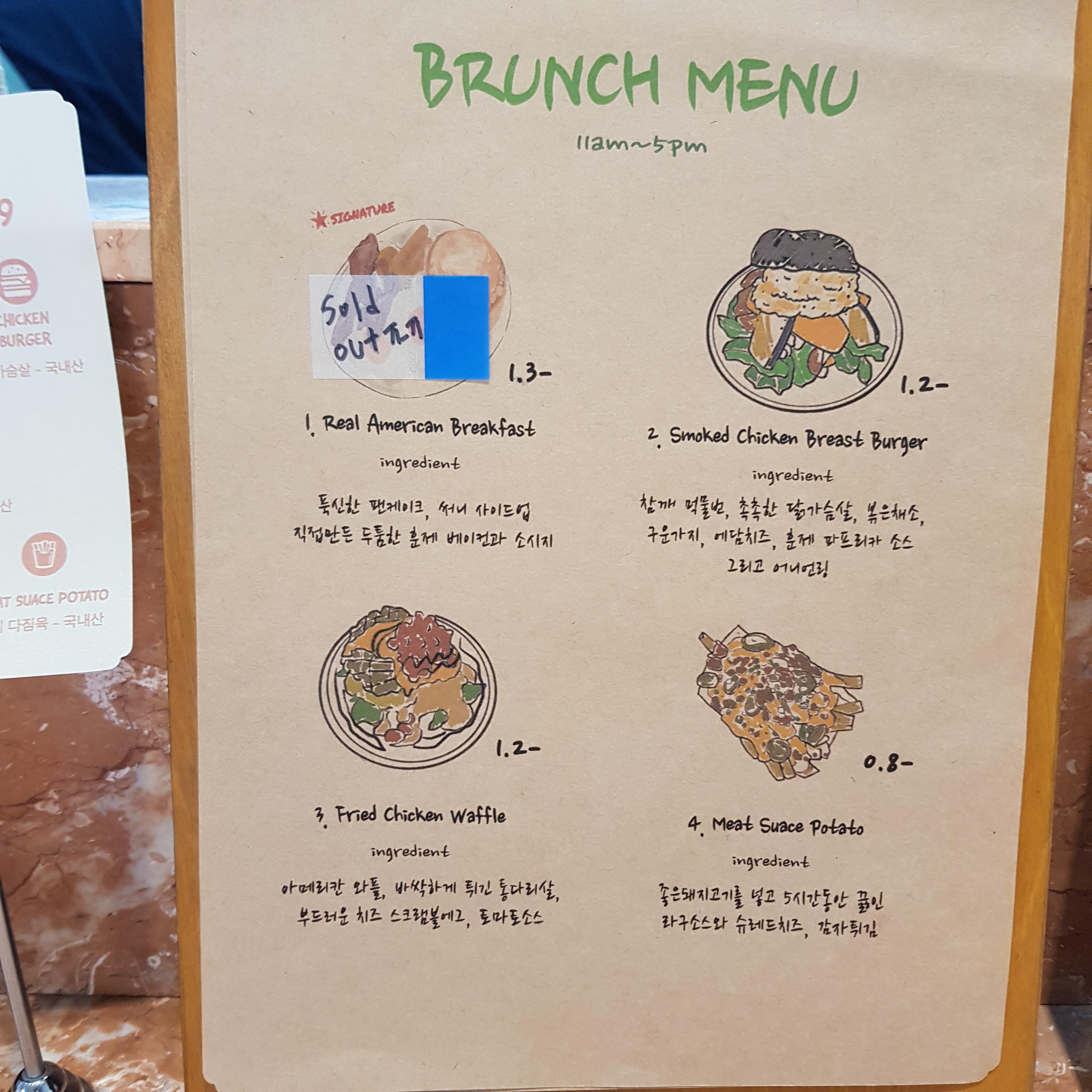 브런치 메뉴는 진짜 미국식 아침식사, 훈제치킨 가슴살 버거랑 프라이드 치킨 와플, 고기소스감자 이렇게 네종류가 있었는데 저희는 훈제치킨 가슴살 버거랑 프라이드 치킨 와플을 주문했답니다.