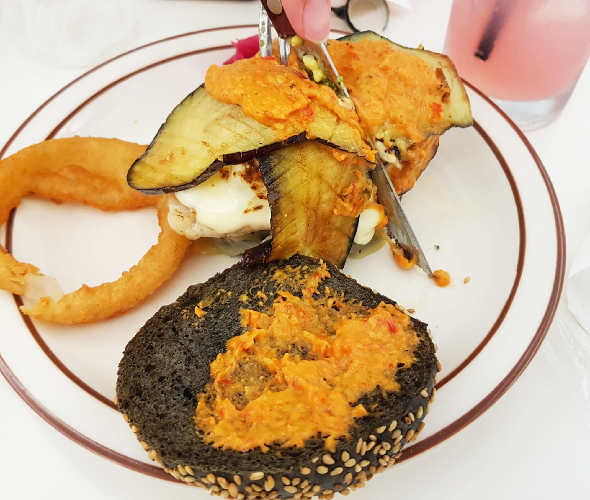 이건 훈제치킨 가슴살 버거예요. 안에 구운 가지와 볶은 야채 순두부를 이용해 만든 소스, 치즈 그리고