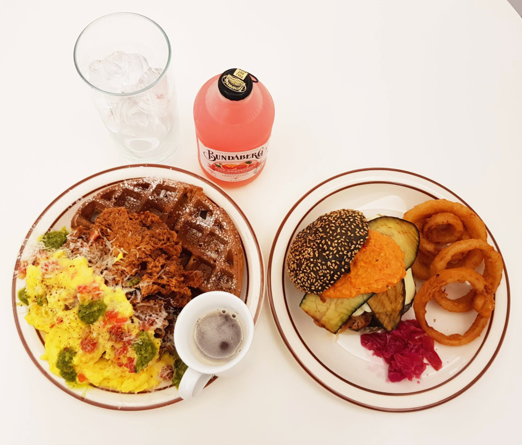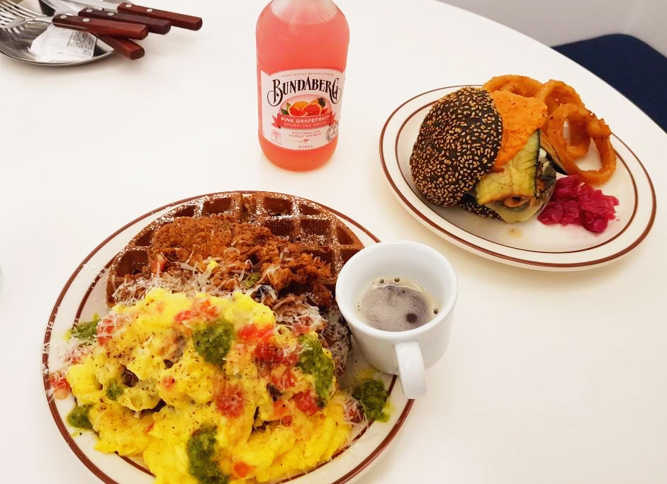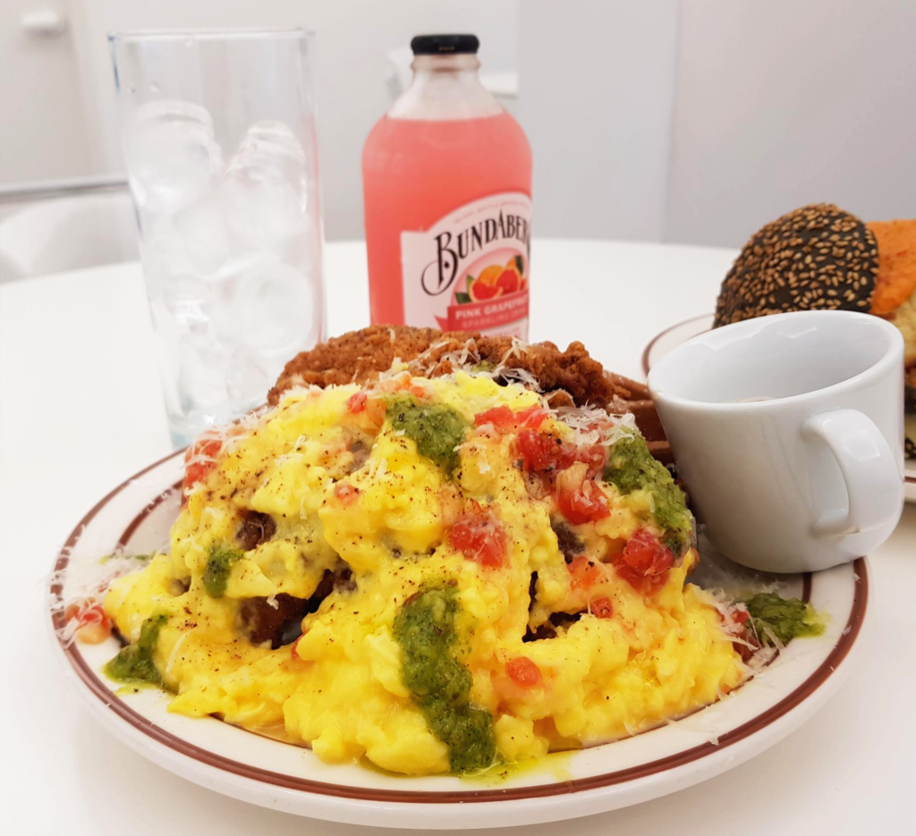 우선 프라이드 치킨 와플이예요. 치즈와 바질 페스토(?)와 토마토가 들어간 스크램블 에그와 바삭하게 튀긴 통다리살 치킨 튀김, 그리고 메이플 시럽과 와플이예요.
