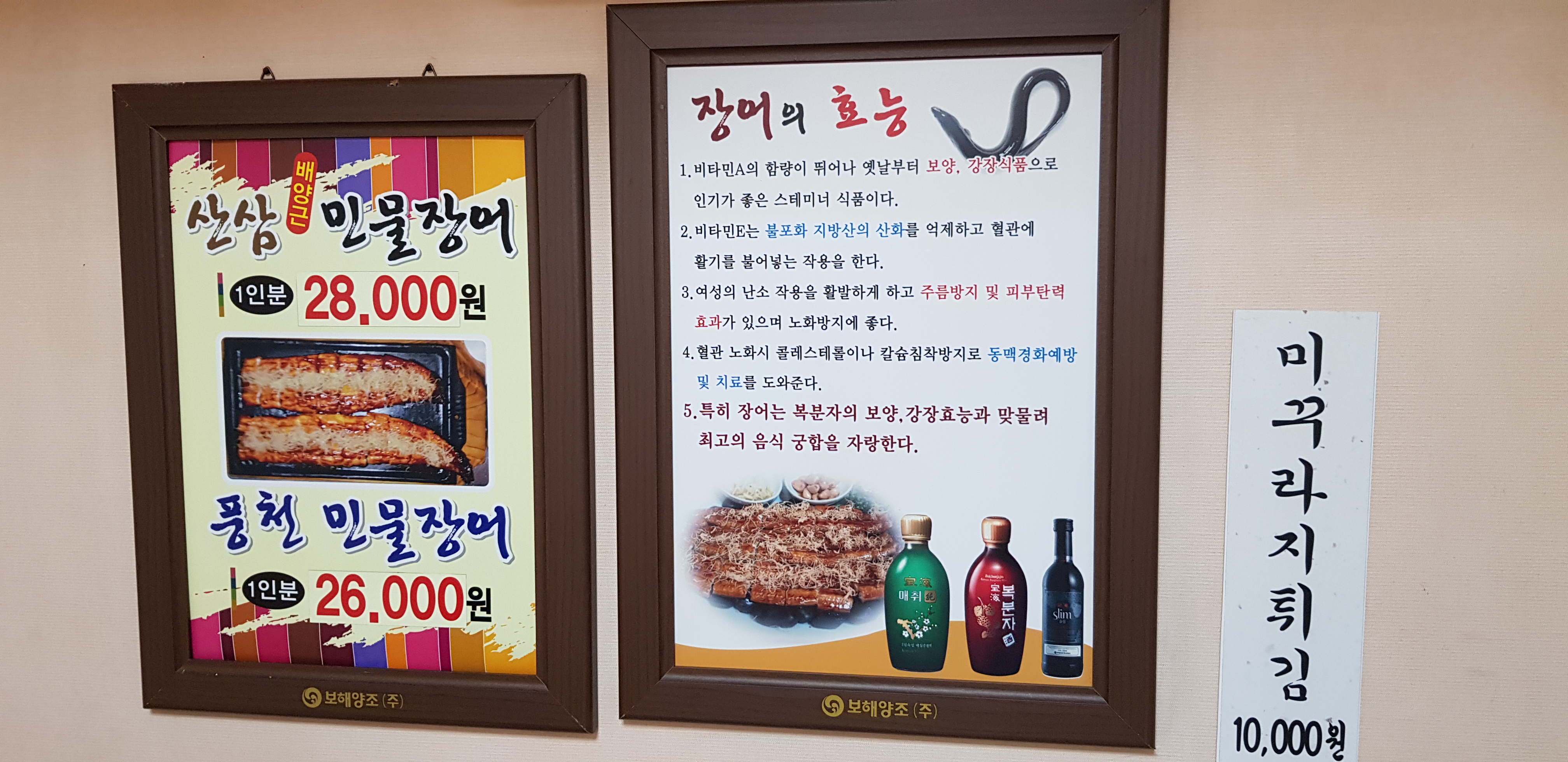 장어의 효능이 벽을 장식하고 있습니다. 장어가 몸에 좋은 건 다 아시죠.