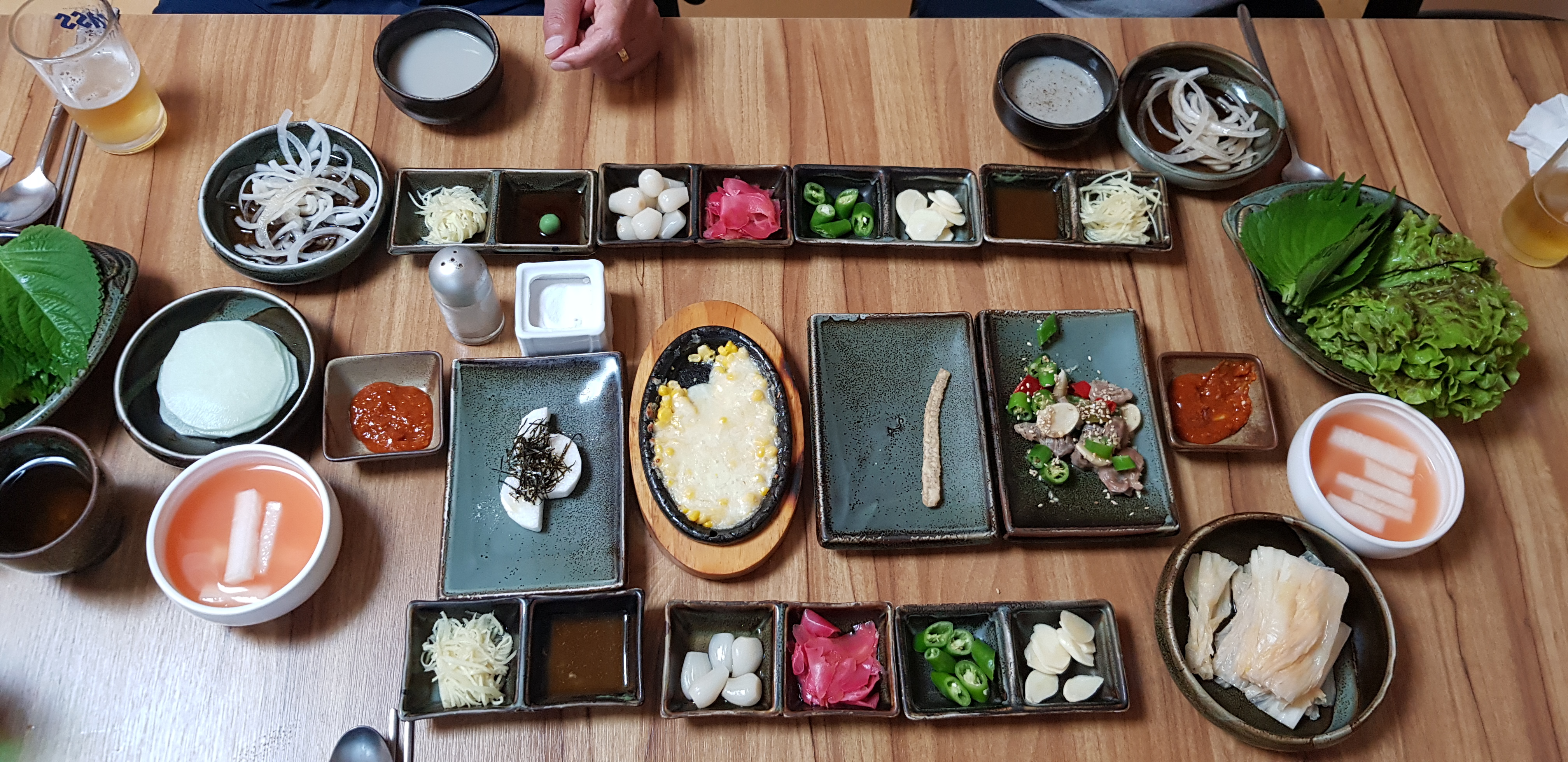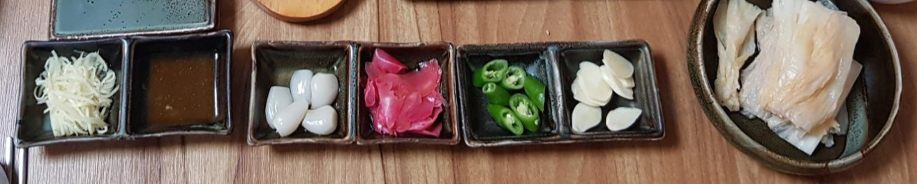 쌈무, 락교, 생강절임, 배추 물김치, 마늘, 고추, 쌈 등 다양하게 나왔어요.