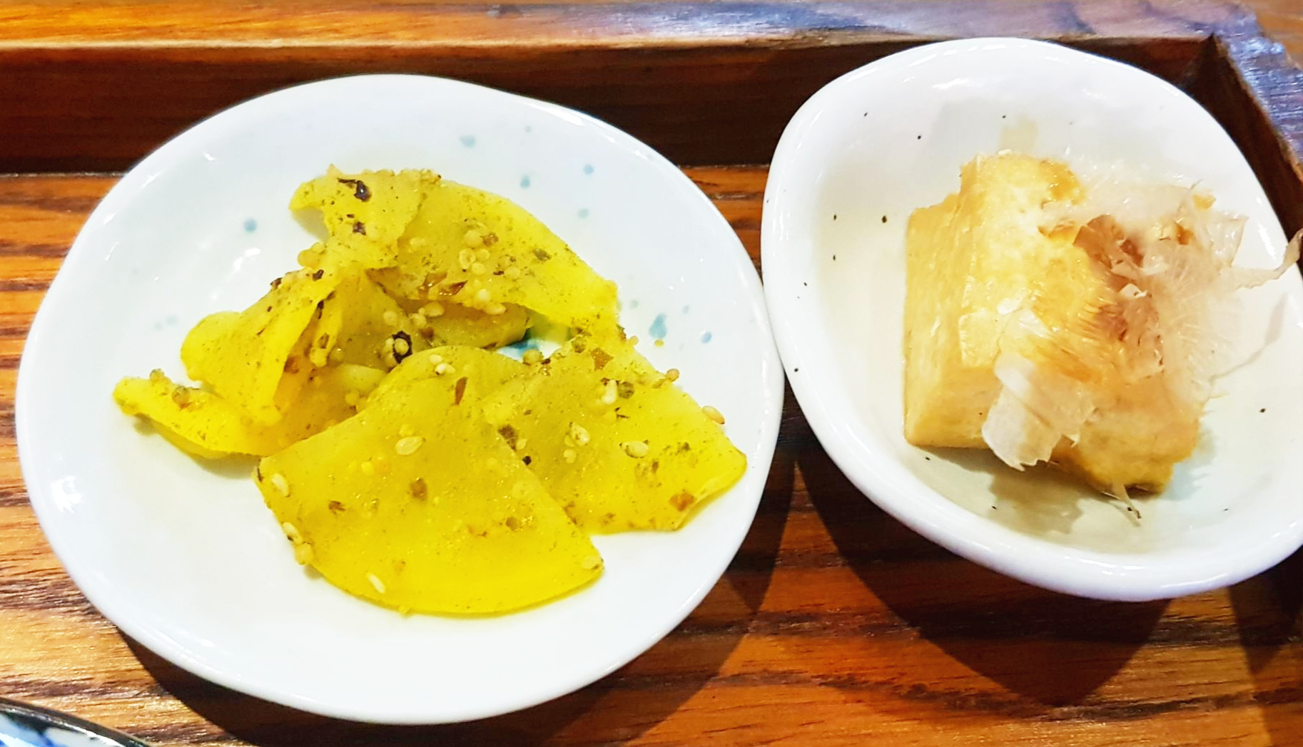 미니 두부에는 가쓰초부시가 올라가있어요. 일본식 두부조림 나름 괜찮았어요. 그리고 단무지도 무쳐놓으니 반찬으로 맛있었어요.