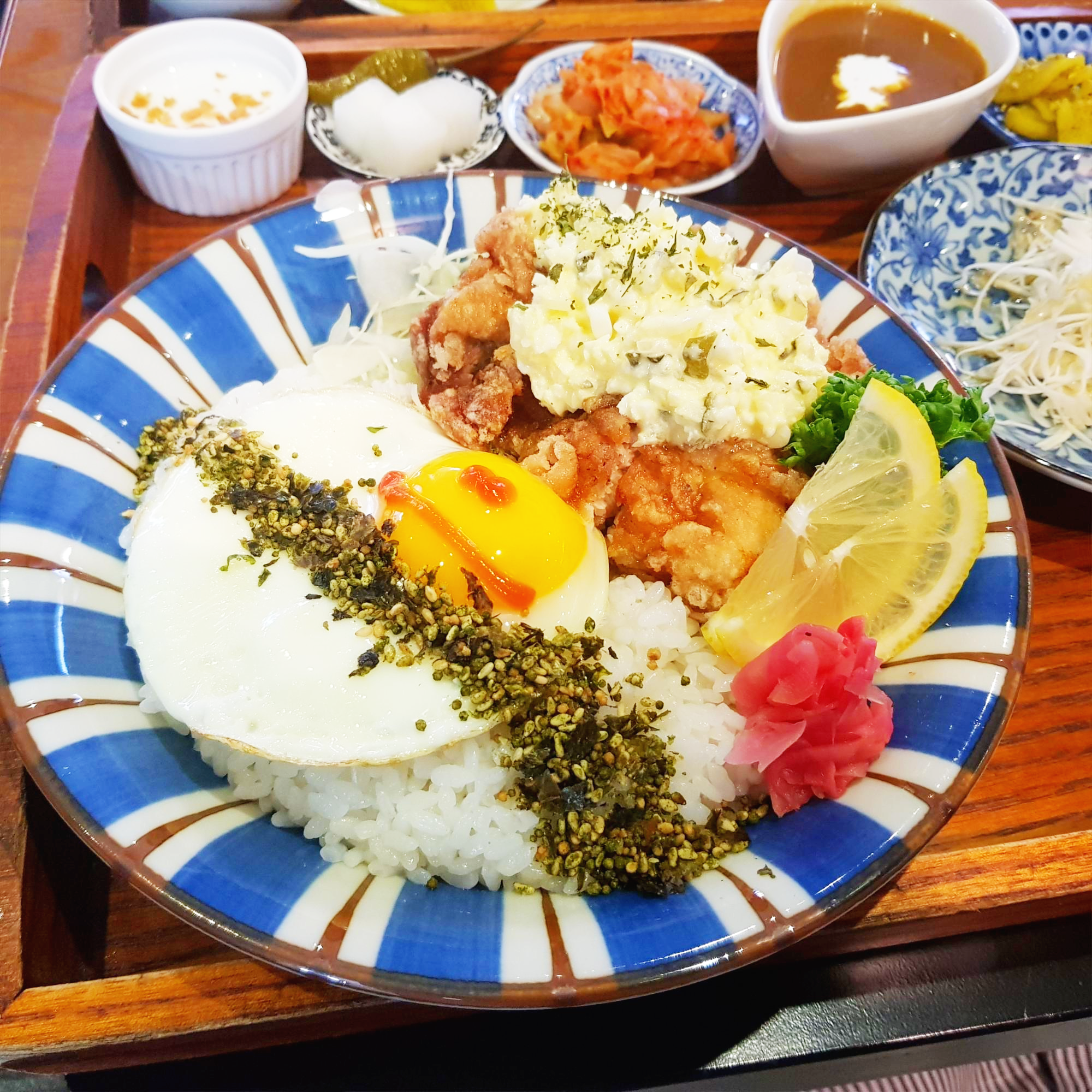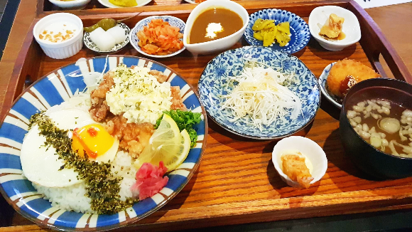 치킨 남방은 치킨 후라이 위에 타르타르소스가 함께 올라가있어요. 그리고 치킨 남방을 세트 메뉴로 주문해서 후리가케위에 달걀 후라이가 올라가있답니다. 케첩으로 귀여운 모양을 그려주셨네요. 그릇도 아기자기하고 음식도 먹음직스러워 보이죠