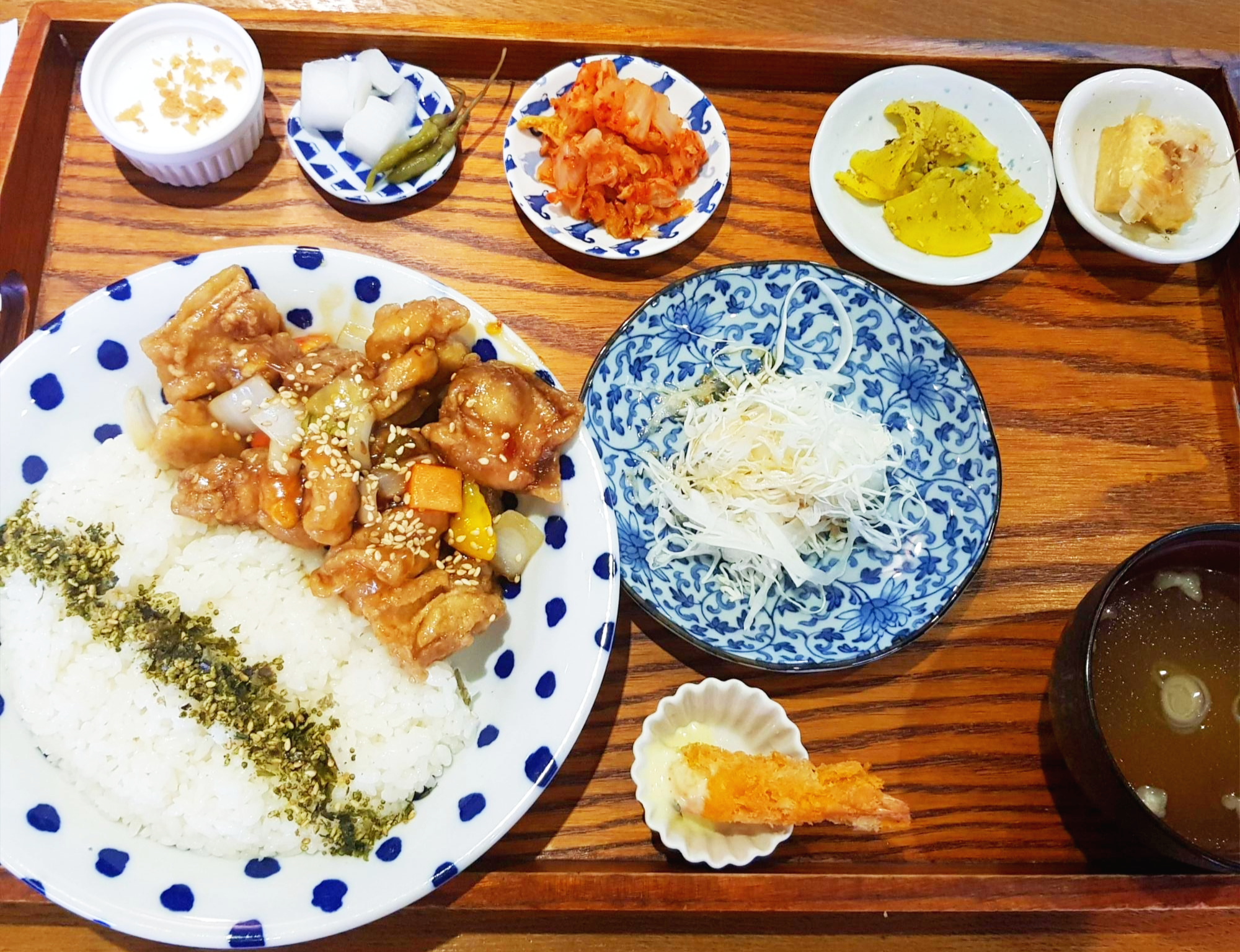 모든 메뉴에는 야채 샐러드, 새우튀김, 국, 단무지, 김치, 두부, 그리고 무가 나오는데요! 세트로 2500원 추가 하시면 야채 고로케와 카레, 달걀 후라이가 추가 되니 양을 많이 드시는 분들이라면 추가하시면 좋을 것 같아요. 보시기에도 푸짐한 한상이죠