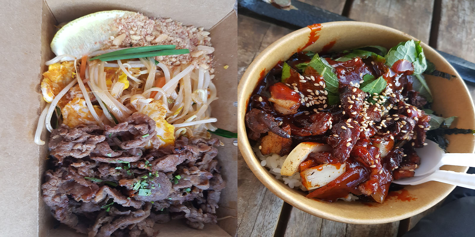 막창 덮밥은 매콤하면서 깻잎이 들어가 먹을 때마다 깻잎 향이 나서 더 맛있었어요. 불고기 파타야는 면과 숙주나물이 어울려서 구운 불고기와 만나니 추운 곳에서 먹었는데도 정말 맛있었어요.