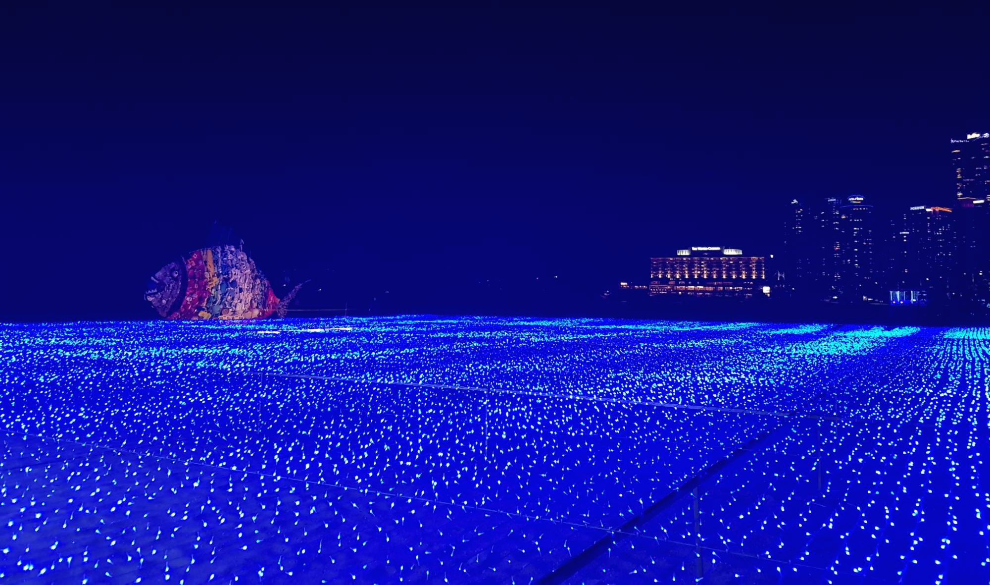 빛의 파도위에서 물고기가 헤엄치고 등대처럼 불을 밝힌 조선비치가 어우러져 해운대 백사장이 더 화려하게 변해 해운대 빛 축제가 절정을 이루었어요.