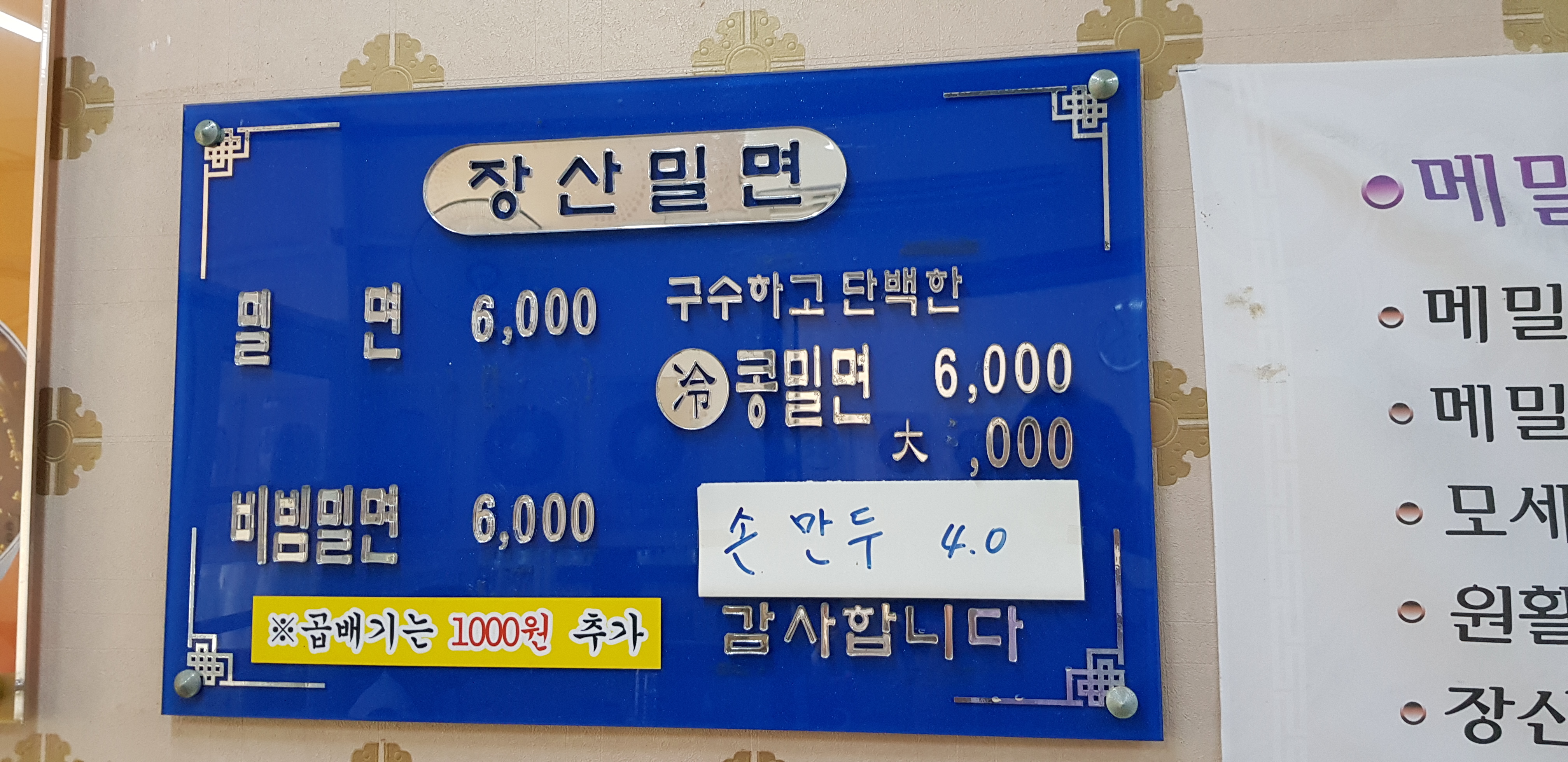 장산밀면집은 밀면전문점이라 메뉴는 밀면과 만두만 판매하고 있습니다. 가격은 밀면 비빔밀면 둘다 6000원이라 참 착한 것 같아요. 오늘은 만두는 안시켰지만 가면 한 번씩 먹는데 장산밀면 만두도 참 맛있습니다. 국내산 재료만 사용하고 만두피도 얇고 속도 알찬 수제만두입니다.