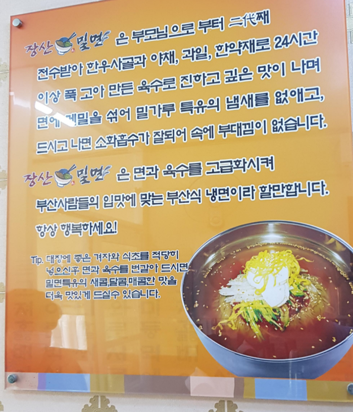 또한 장산밀면만의 비법인 십여가지 이상의 재료로 만든 양념장, 그리고 한우사골과 여러가지 한약재로 24시간 이상 고아 진한 육수와 밀면 특유의 새콤,달콤매콤한 맛을 즐길 수 있어 맛집으로도 알아주는 곳입니다.