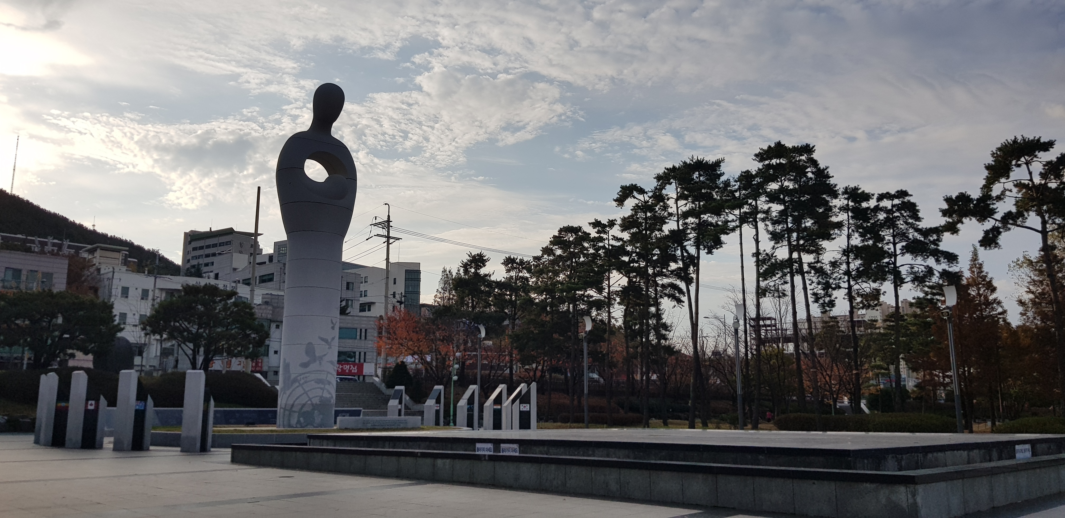 중앙분수와 함께 한국전쟁 UN군 활동기념 조형물이 있는 평화의 광장이에요. 중앙 분수는 여름이면 워터풀장 2개, 유아풀장 1개, 수상 슬라이드, 탈의실, 그늘막 쉬터 등이 설치되어 어린이들에게 물놀이장으로도 개장된다고 해요. 이렇게 아이들이 잘 놀 수있는 공간이니 당연 인기있겠죠