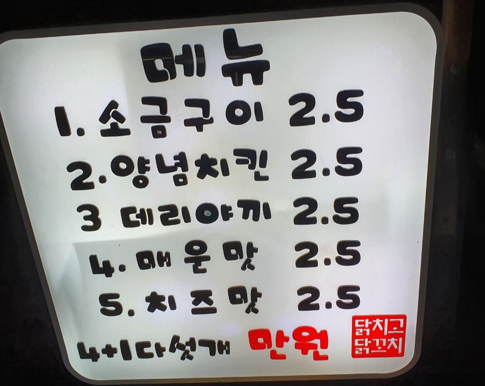 남편이 찍어온 메뉴판입니다. 소금구이, 양념치킨, 데리야끼, 매운맛, 치즈맛이 있는데 각각 2500원입니다.