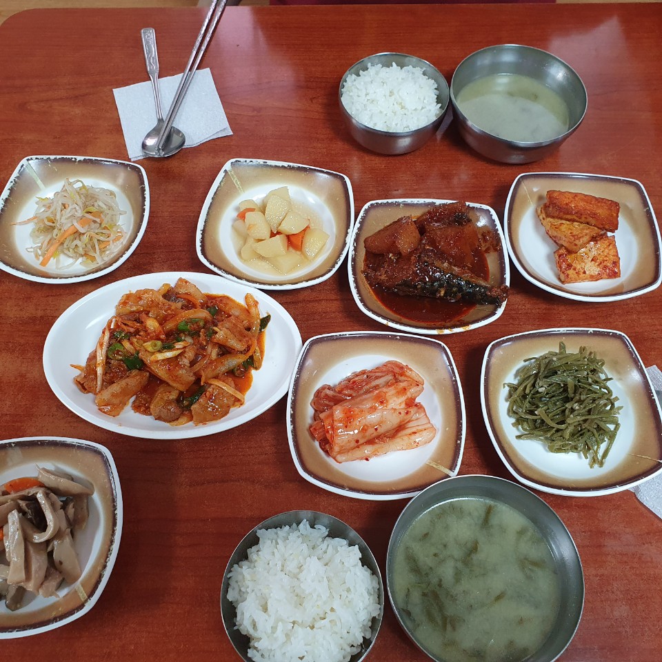 드디어 반찬이 나왔습니다. 숙주나물, 고등어 조림, 감자볶음, 두부조림. 김치. 고구마줄기 볶음, 두루치기