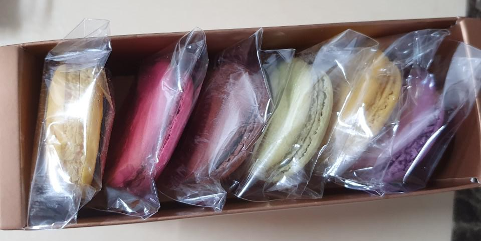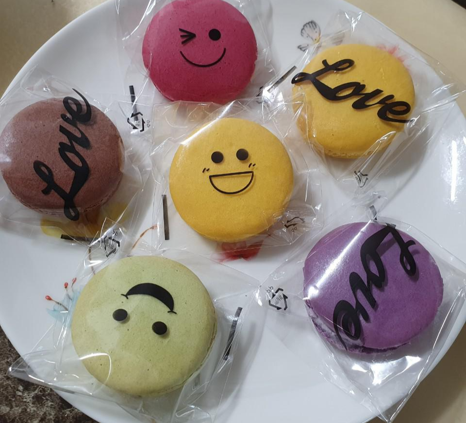 레몬마카롱, 산딸기 마카롱. 초코마카롱, 와사비 마카롱. 레몬마카롱, 블루베리 마카롱이 들어 있었어요.