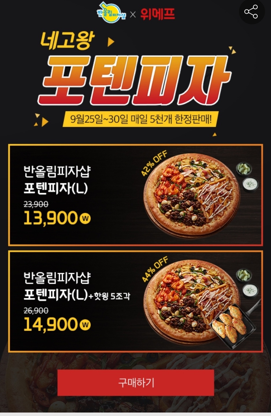 광희가 반올림피자샵에서 네고(협상)을 하고 왔어요! 그 덕분에 반올림 피자샵은 9월 25일부터 9월 30일까지 매일 5천판 위메프에서 판매를 하고 있습니다. 네고왕 포텐피자만 하시면 23900원에서 13900원으로, 핫윙 5조각으 포함하면 26900원에서 14900원으로 약 42%-44% 할인된 금액으로 살 수 있어요
