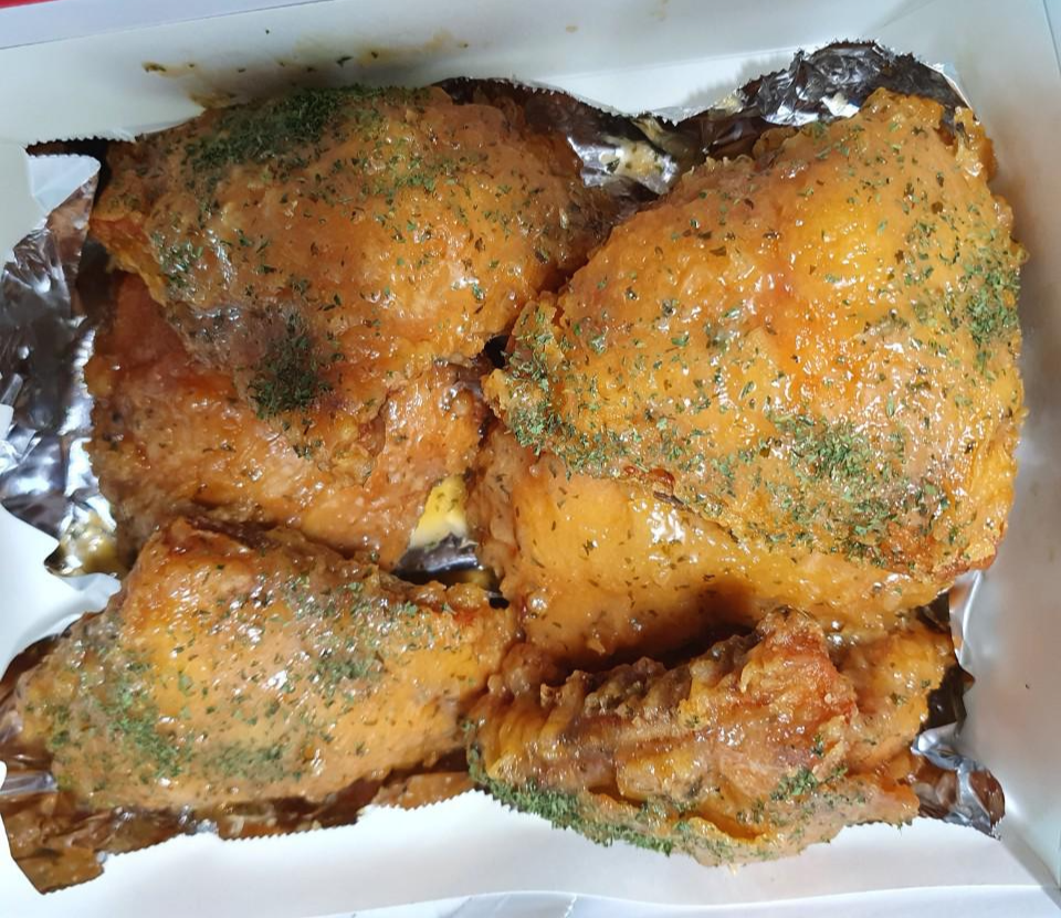 노릇노릇 잘구어진 치킨위에 맛있게 갈릭 버터 소스가 발라져있고 파슬리까지 뿌려져 먹기도 전에 달콤한 카라멜 팝콘 향이 났어요. 딸은 갈릭버터 마늘빵 향도 난다고 하더라구요.