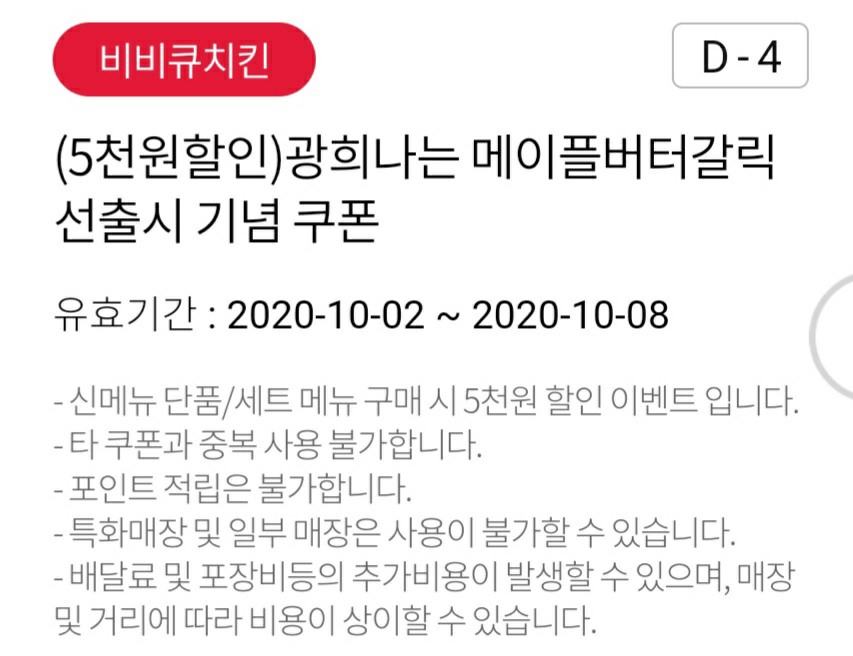 세번째 네고왕 방송 후 시간부터 일주일간 BBQ자사앱에서 선출시되는 광희나는 메이플 버터 갈릭 치킨을 추가로 5000원 할인해서 14900원에 판매한다고 합니다.(10월2일-10월8일)