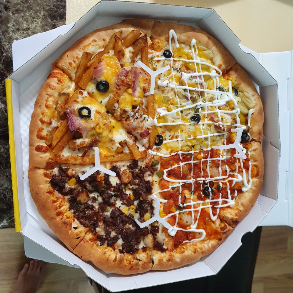 매운치킨과 통통한 새우가 들어 있는 핫치킨 쉬림프입니다. 한입 먹어보니 매운걸 못먹는 제가 먹어도 많이 맵지가 앉아았어요. 맛있게 매운것 같아요. 다들 좋아하실 것 같은 피자입니다.