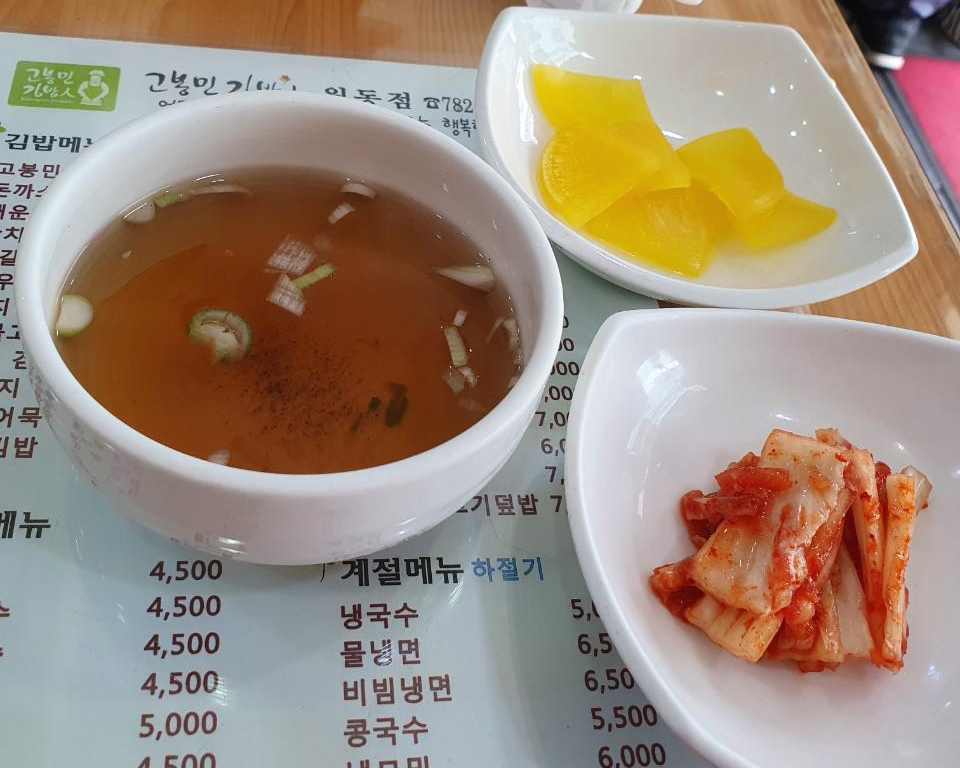 김치, 단무지, 따뜻한 국물이 나왔습니다. 김밥에 단무지는 필수템이죠. ㅎㅎ