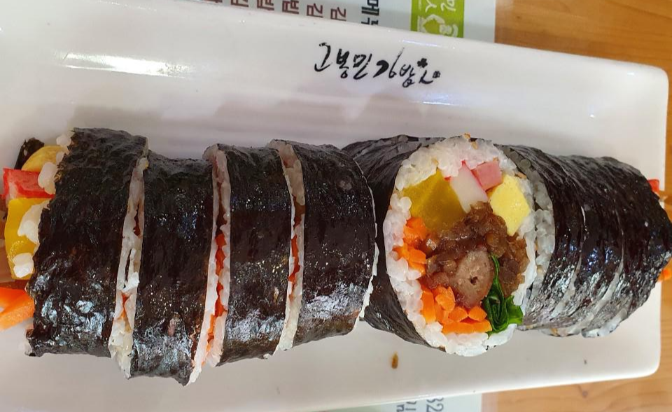 떡갈비 김밥입니다. 고봉민 김밥인은 속 내용물이 푸짐한게 매력이에요.