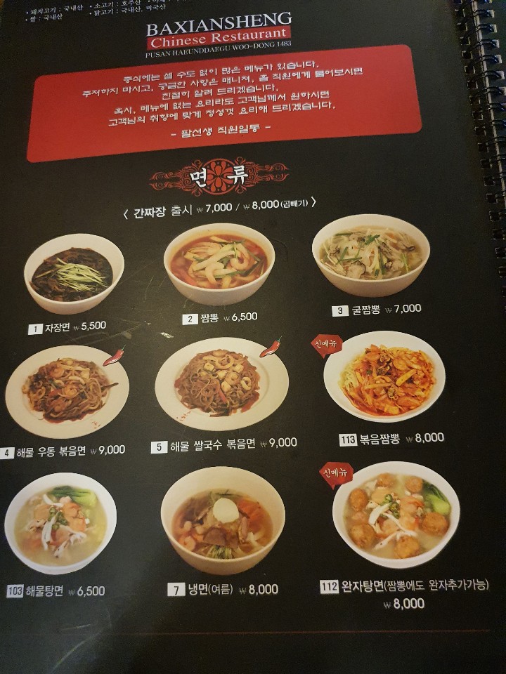 면요리, 닭요리, 돼지고기 요리, 소고기요리, 야채및 두부요리, 볶음밥, 탕요리, 냉채요리, 해물요리, 코스요리등 중식에는 셀 수도 없이 많은 메뉴가 있습니다. 궁금한 점이 있아면 주저하지 마시고 매니저나 홀 직원에게 물어보면 친철하세 답변드리겠다는 문구도 있네요. 팔선생은 정말 메뉴가 많더라구요,