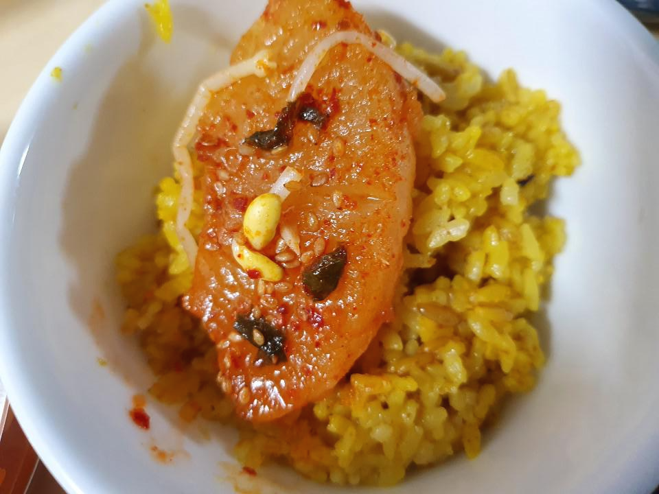 저희 집은 강황밥을 해먹는데요.알맞게 졸여진 무우랑 먹으니 맛있었습니다.