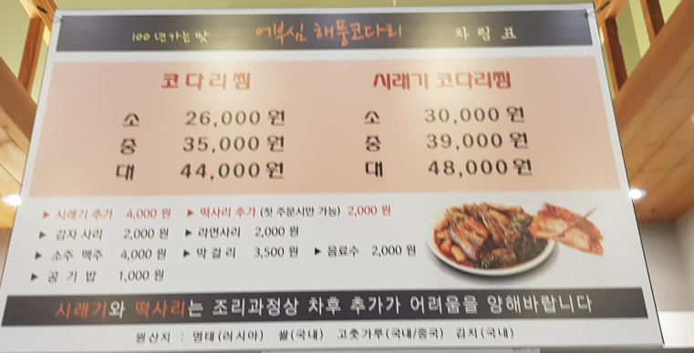 코다리 찜 전문점이라 메뉴는 간단합니다. 일반 코다리찜이랑 시래기가 들어간 시래기 코다리찜 두종류만 있습니다.