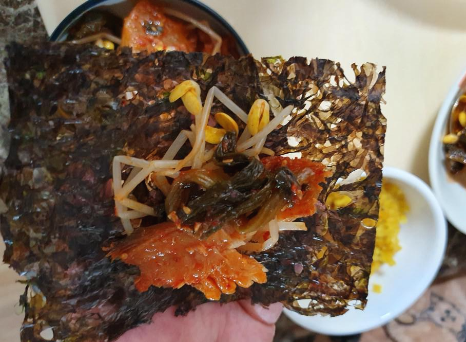 어부심 해풍코다리찜 가게에서 보내준 김에 코다리랑 시래기, 콩나물까지 올려 쌈싸먹으니 김이 매콤한 맛을 잡아주면서 김과도 잘어울려 계속 먹게되더라구요. 코다리찜에 김으로 쌈싸먹는건 생각치도 못했는데 색다르면서 생각보다 잘 어울렸어요.
