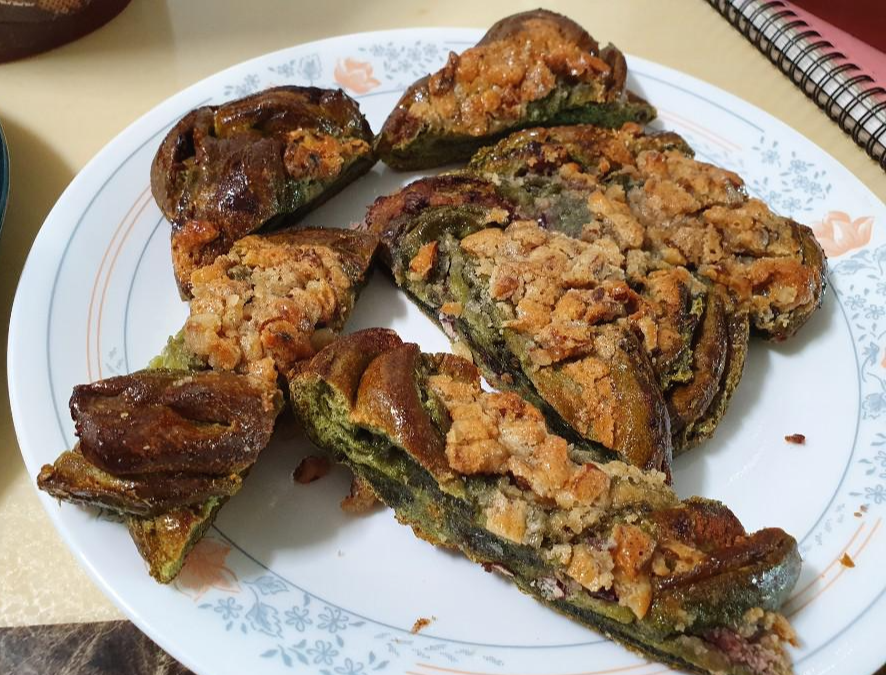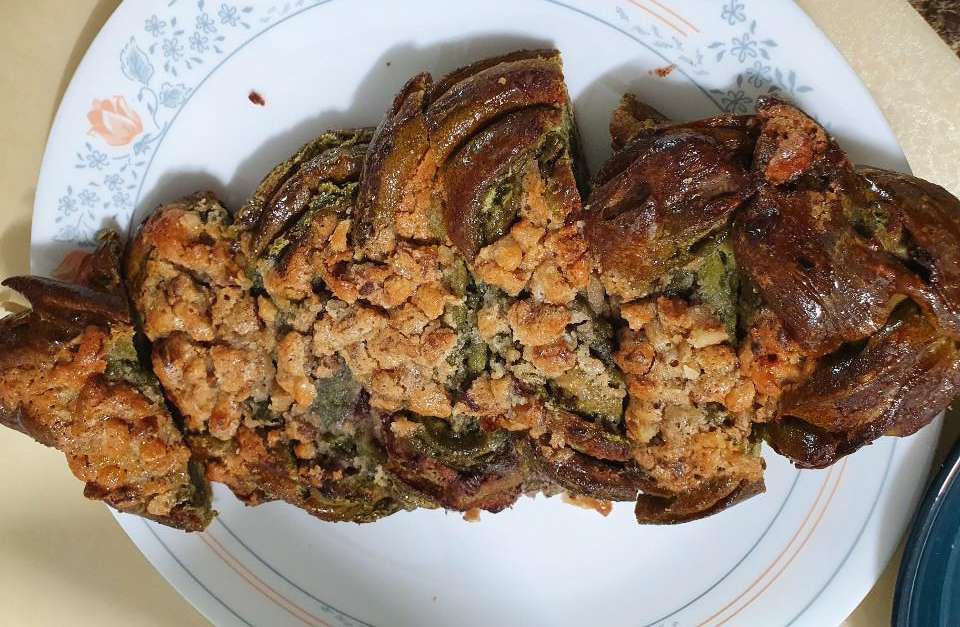겉은 시럽이 묻혀진 호두가 듬뿍 있구요, 속은 쑥떡도 있고 쑥향이 은은하게 나는 쑥빵이예요. 한입먹어보니 쫄깃쫄깃 하면서 식감이 정말 좋더라구요, 왜 사람들이 맛있다고 추천하는지 알겠더라구요.