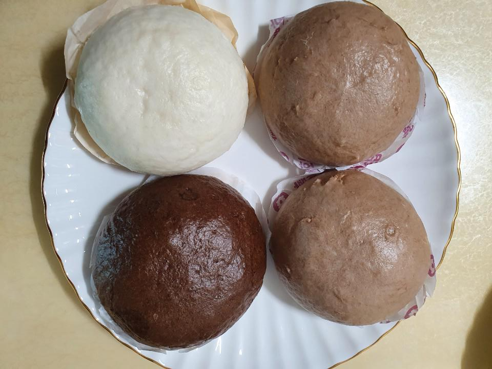 맛 들이 다양해서 딱 봐도 어떤 호빵인지 다 알겠죠 ㅎㅎ 하얀게 이천 쌀 호빵이고, 초코색이 허쉬 초코이고 마지막으로 갈색은 공주 밤 호빵입니다. 접시를 받자마자 이렇게 담아봤습니다.ㅎㅎ