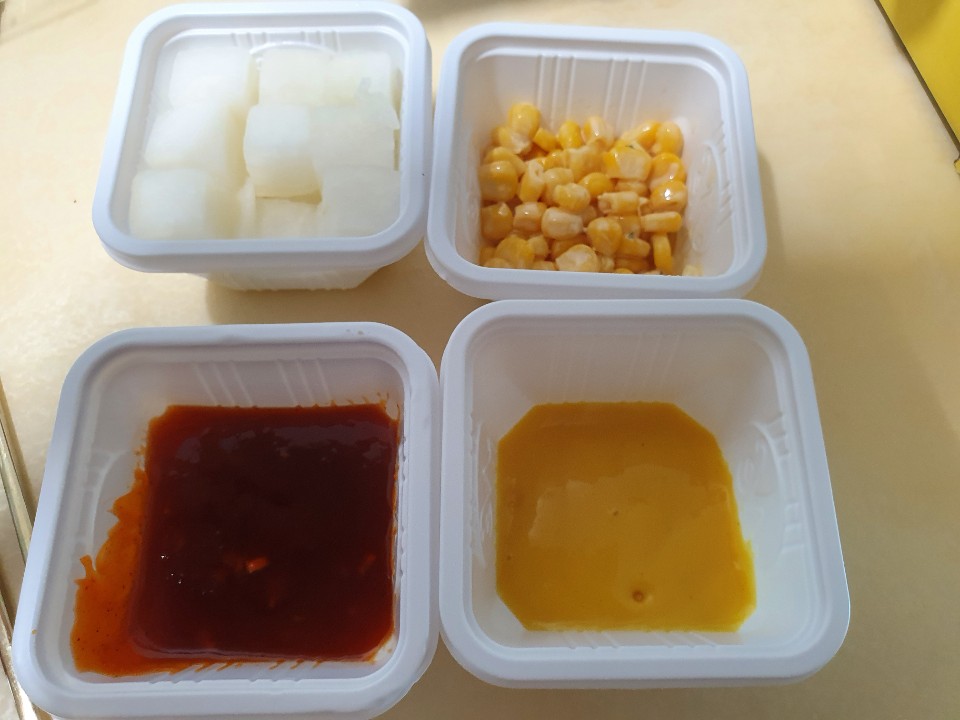 소스랑 콘샐러드는 들어있어 좋았는데 치킨에 빠지면 섭섭한 무우가 너무 적어 아쉬웠어요.