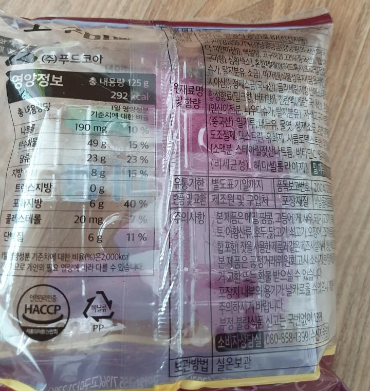총내용량은 125g에 칼로리는 292kcal입니다. 고구마 앙금이 55.71%(고구마 21.22%), 자색고구마 분말이 43% 함유되어있다고 합니다.