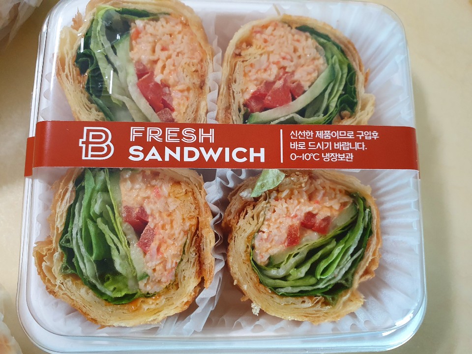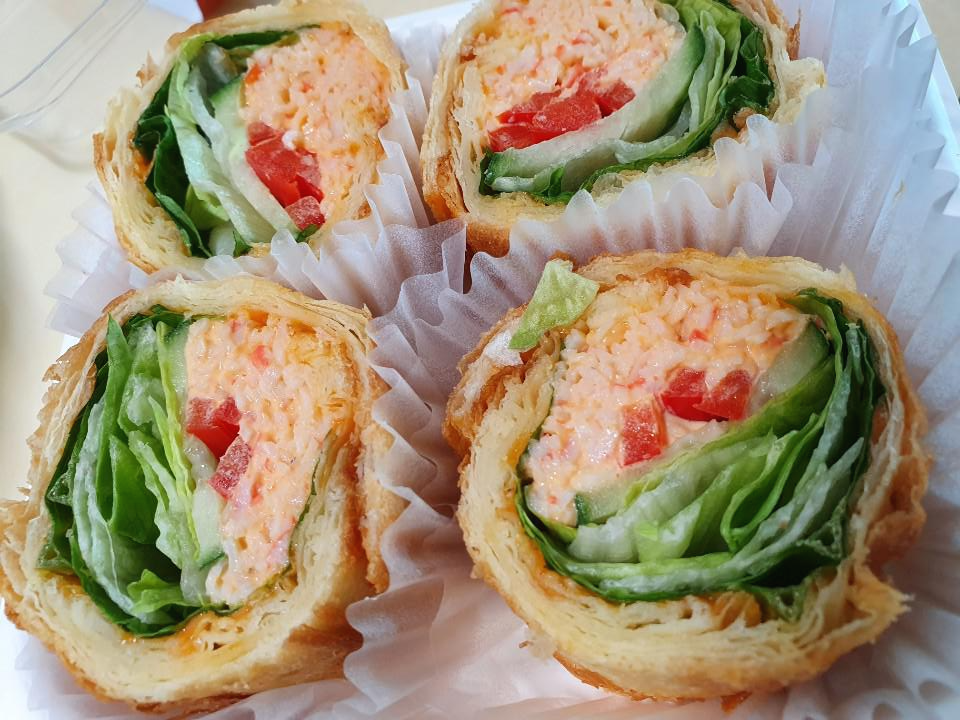 고소한 크런치 빵에 매콤한 사천소스로 버무린 게맛살과 아삭한 채소를 더한 매콤한 샌드위치입니다.