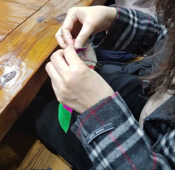 조각보를 만드는 시간이 주어져 한땀 한땀 꿰매면서 선생님의 작품은 자투리 천을 이어서 한 작품마다 몇개월 길게는 1년도 걸린다는 생각을 하니 대단한 정성이 아니면 안된다는 생각이 들었어요.