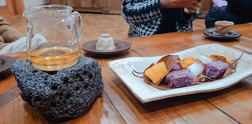 1층 견학이 끝나고 2층으로 자리를 옮겨 조각보를 만들어 보는 시간이 열리기 전에 다과 시간이 주어졌어요.