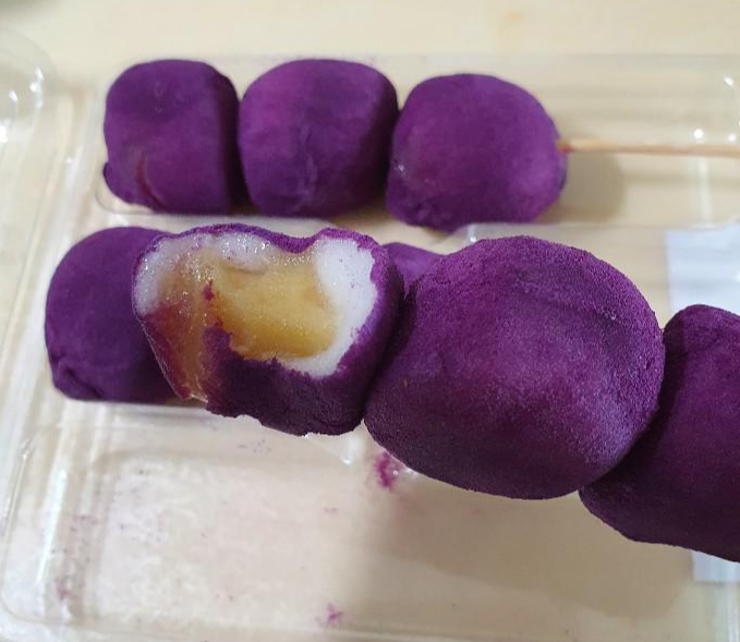 두번째는 CU 고구마찰떡꼬치입니다. 쫀득한 찰떡에 속은 고구마 앙금으로 되어있구요, 겉은 자색고구마 가루가 묻혀져있어 색깔도 이쁩니다. 가격은 2800원입니다.