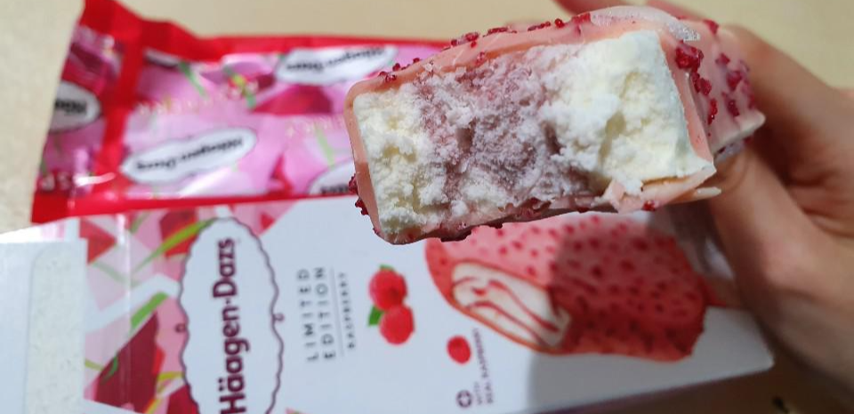 하겐다즈 라즈베리 스틱바는 부드러운 라즈베리 아이스크림에 이색적인 라즈베리 소스를 더했다고 합니다