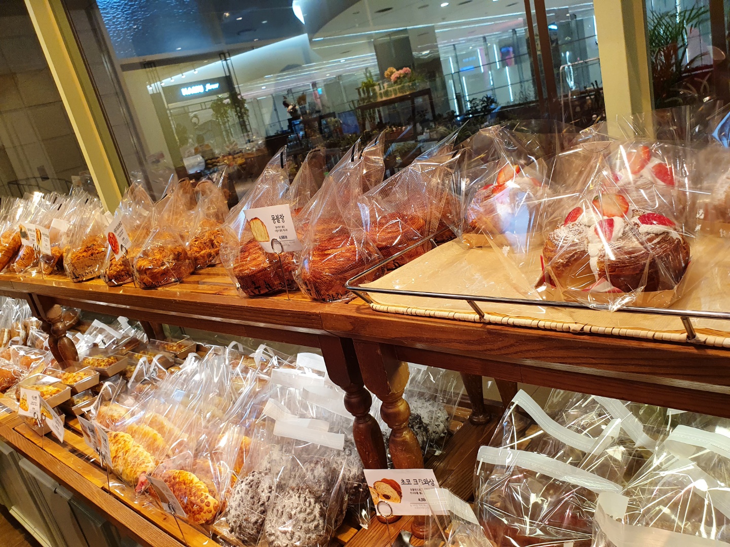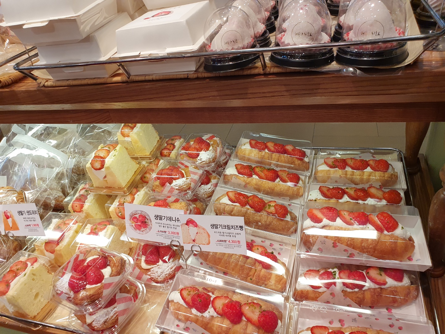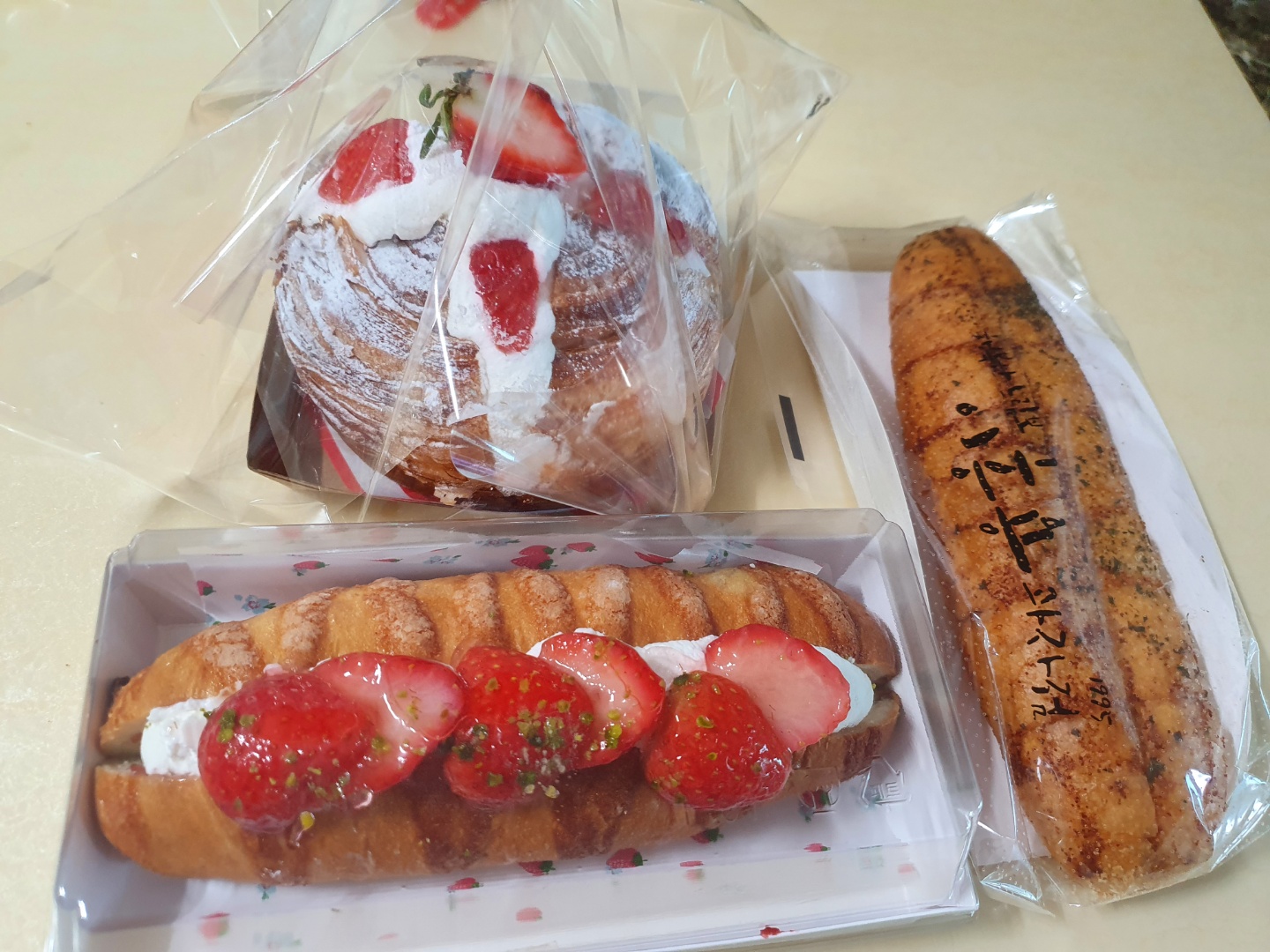 맛있는 빵들을 안 사올 수가 없죠. 딸기 제품 빵들은 10% 할인되고 있었어요.