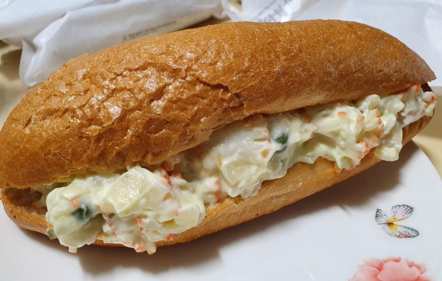 저도 맛이 궁금해 한입먹어보니 크래미랑 야채들이 마요네즈에 버무여져 있고 오이도 들어있어 우리가 사먹는 사라다 빵 맛이었어요. 무엇보다도 크래미가 큼직하게 들어있어 식감도 좋고 맛있었습니다.