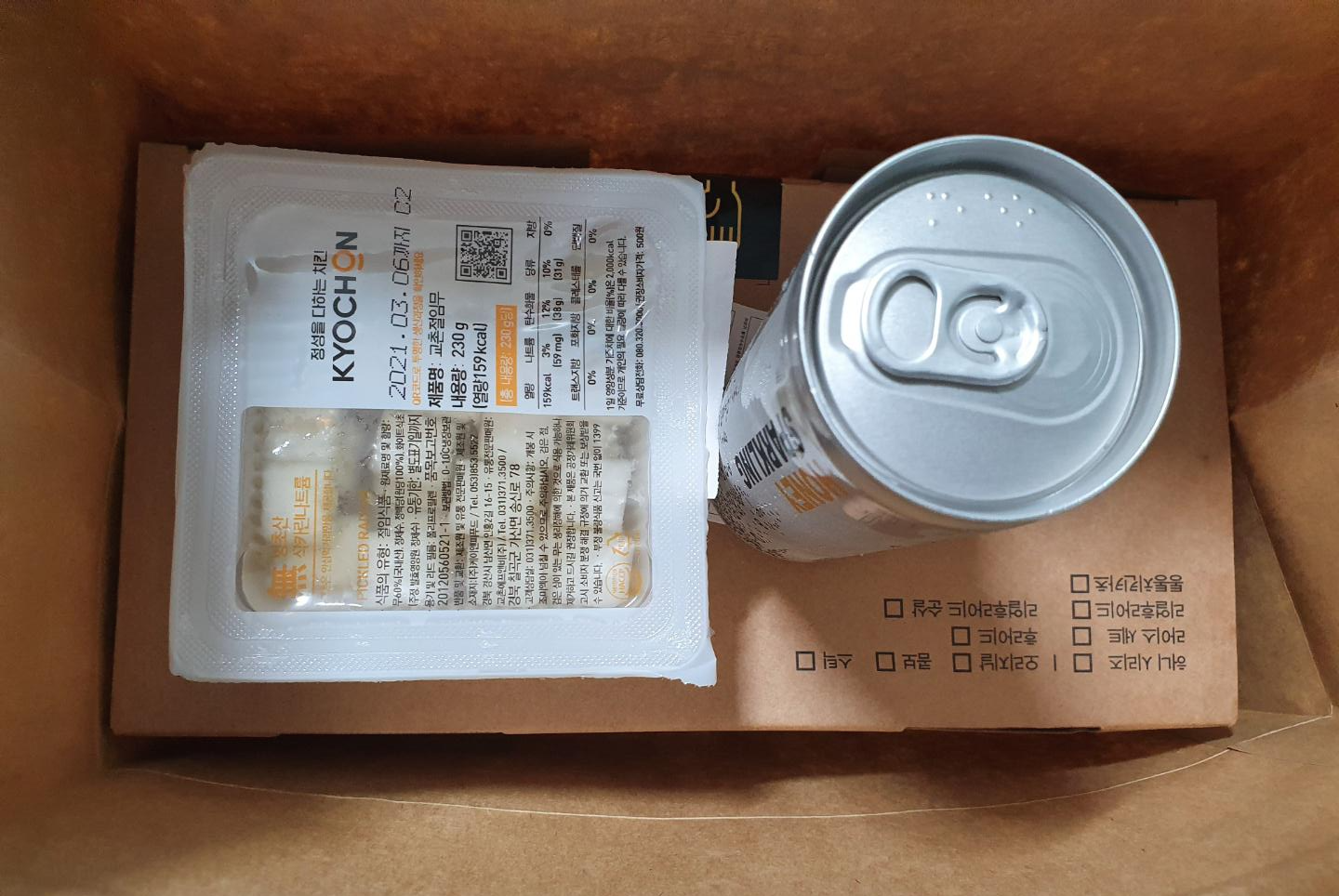치킨과 단짝 치킨무, 교촌허니 스파클링이 왔네요. 콜라였음 더 좋았을텐데 제가 잘 안 먹는 스파클링이라 아쉽네요.