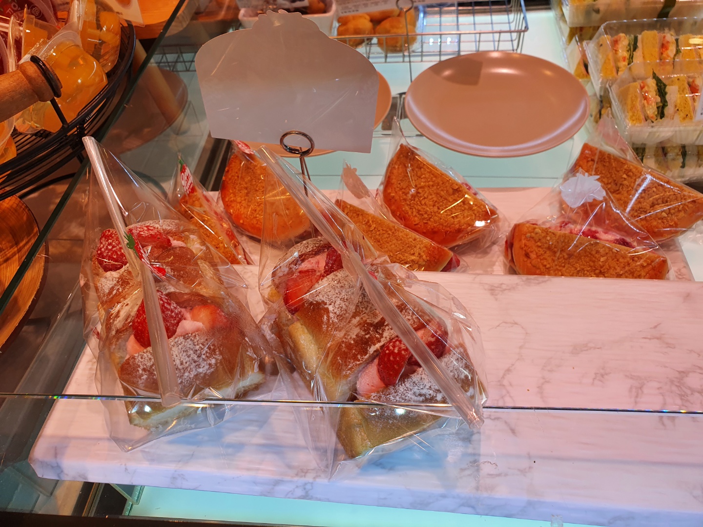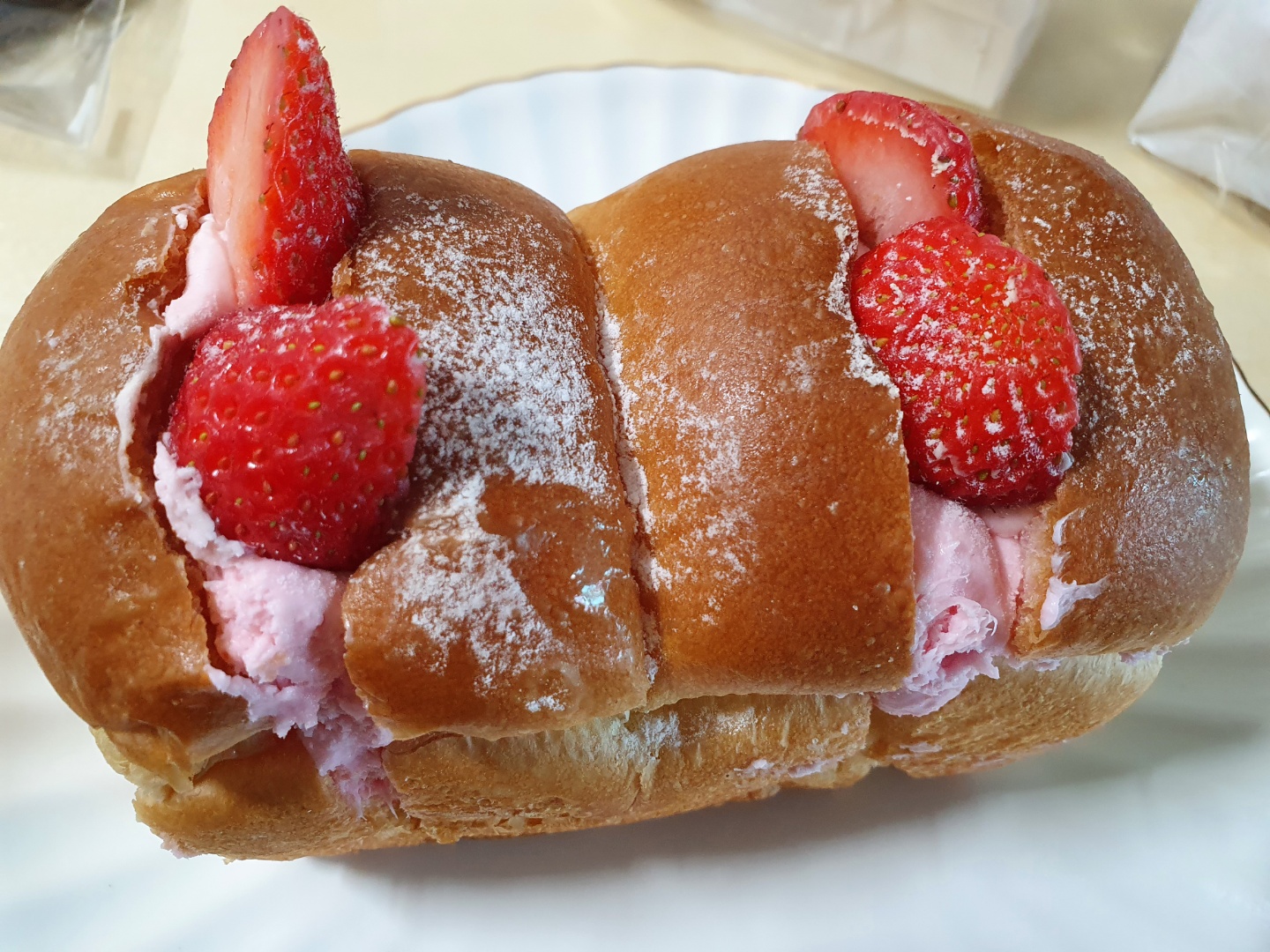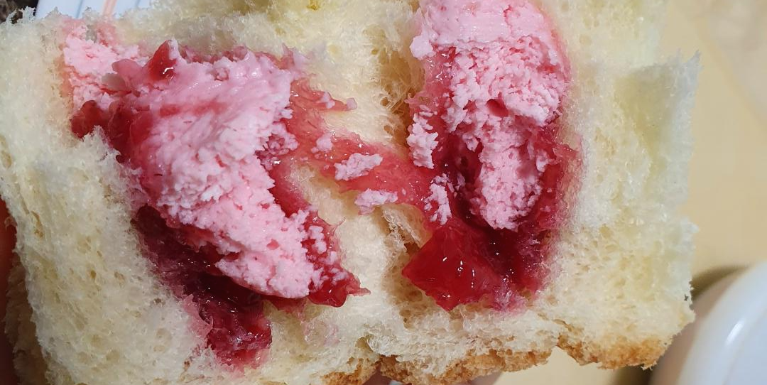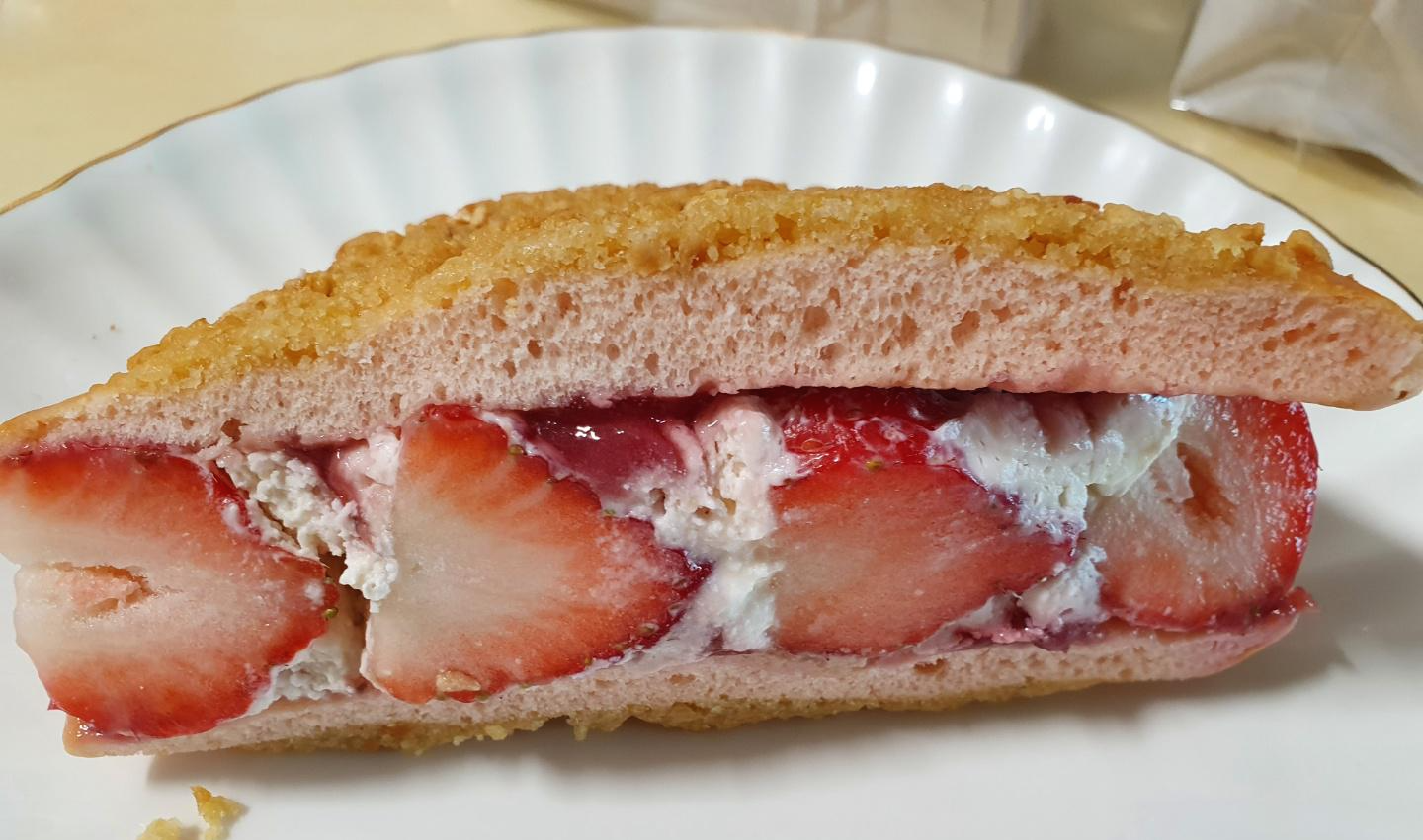 부드러운 식빵사이로 딸기쨈과 딸기요거트 크림이 들어 있었는데 한입먹어보니 많이 달지는 않고 적당히 달콤 한 것이 부드러우면서 맛있었어요.