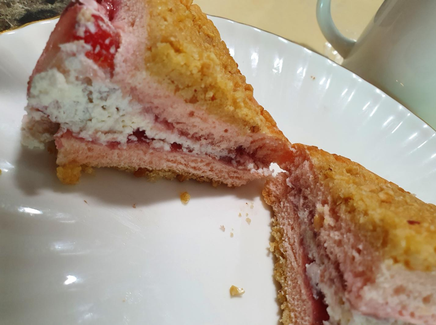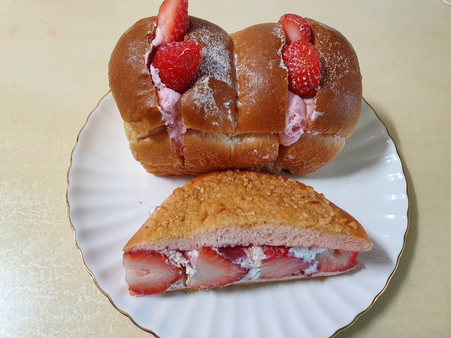 반을 잘라보니 떨가쨈을 겉에 얇게 바르고 생크림이 발라져있고 그위에 딸기가 올려져 있는데 먹어보니 소보루 빵의 고소함과 딸기쨈의 달콤함이 느껴졌지만 마스카포네 치즈크림을 좀 더 넣어줬으면 더 맛있었겠다는 생각이 들어요.