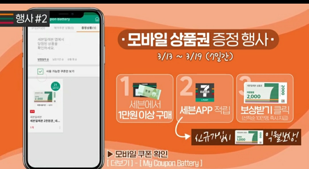 2.세븐일레븐에서 1만원 구매 후 세븐일레븐 APP적립시 2000원 모바일 상품권을 증정한다고 합니다.