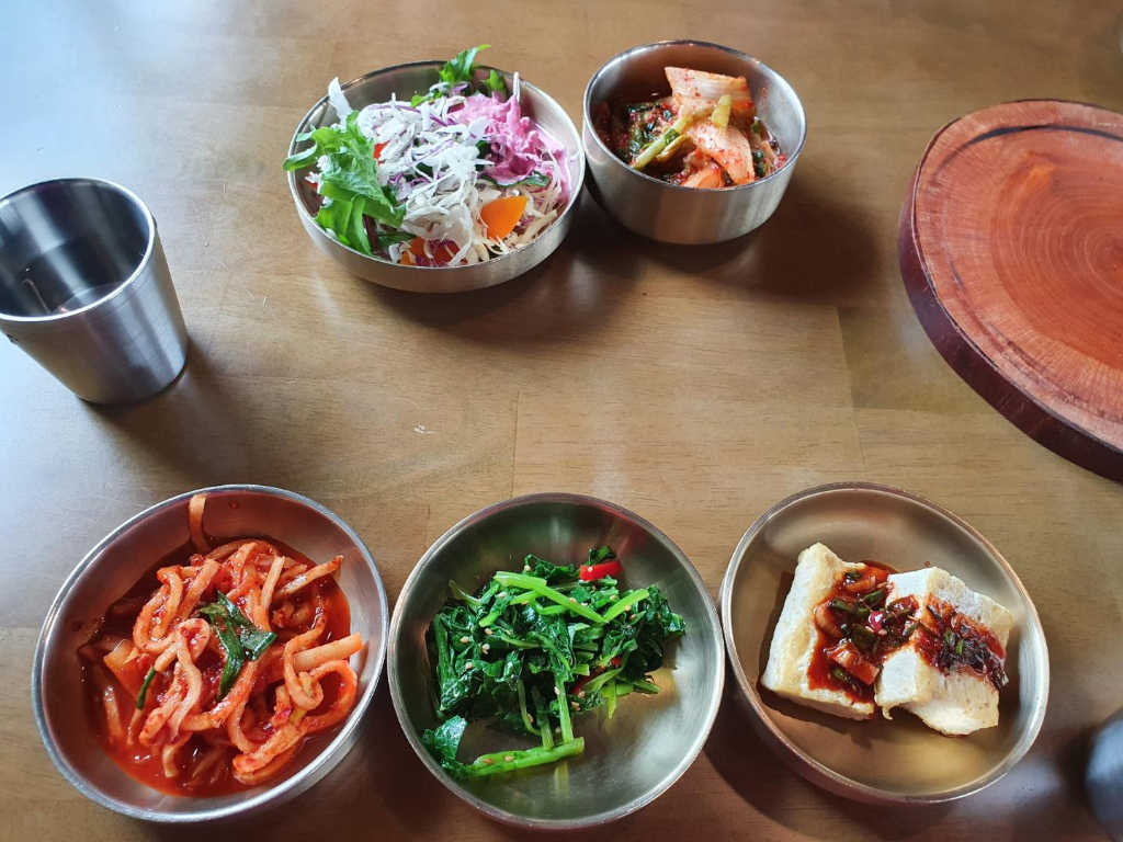샐러드, 나물, 김치, 두부조림, 무우채 가 기본 반찬으로 깔끔하게 나왔어요.