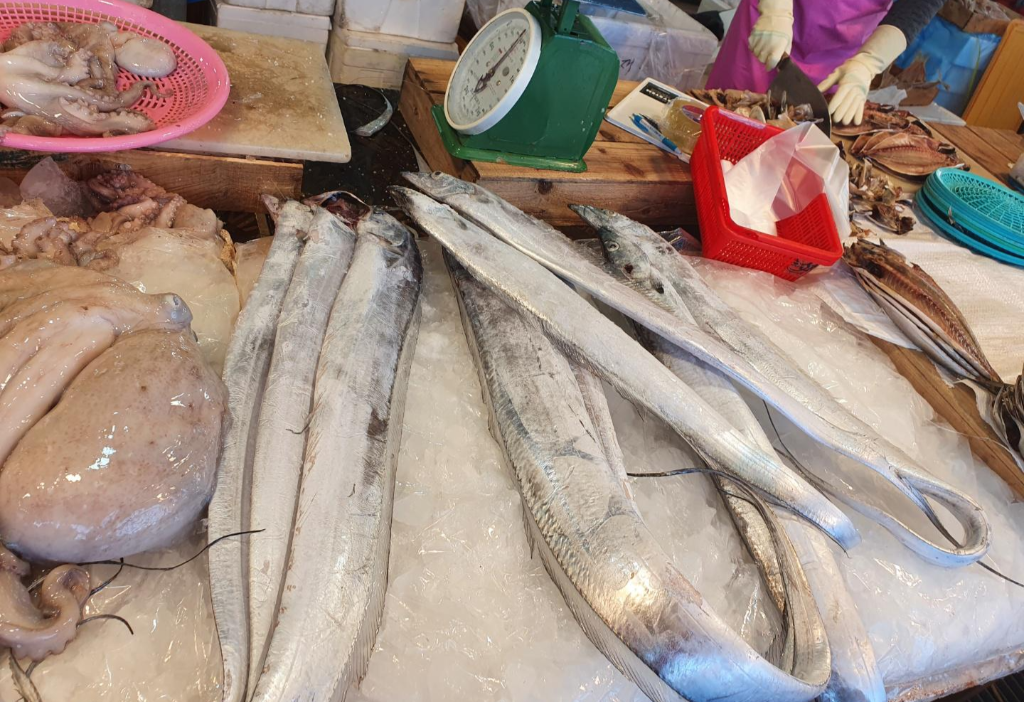 큼직한 갈치 보이죠, 세화 민속 오일장은 갈치, 오징어, 고등어 등 싱싱한 생선들이 정말 많았어요.