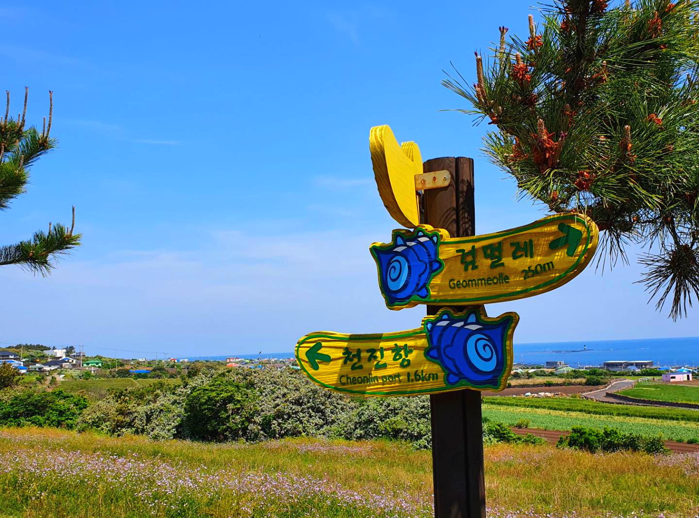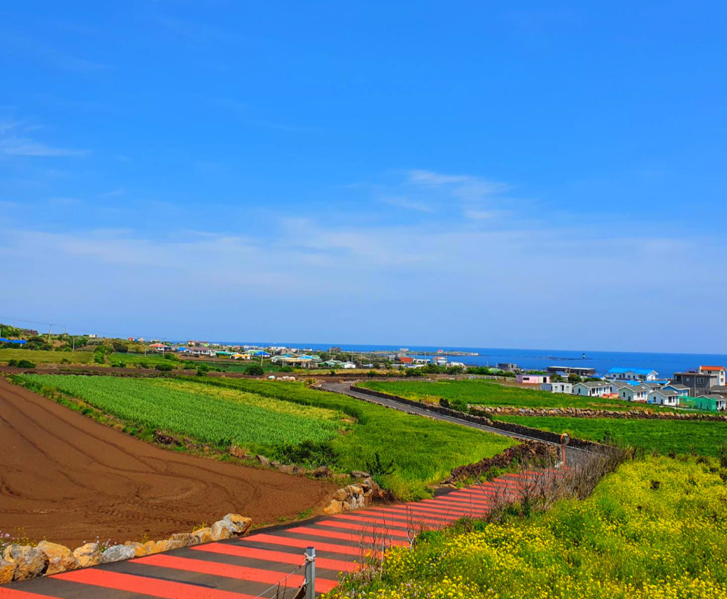 우동봉을 오르는 길 아래로 알록달록 아름다운 마을과 에메랄드 빛 바다, 초록초록 푸른 잎들이 잘 어우러져 제주만의 아름다움을 볼 수 있는 것 같아요. 이곳은 멀리 한라산도 한 눈에 볼 수 있어요.