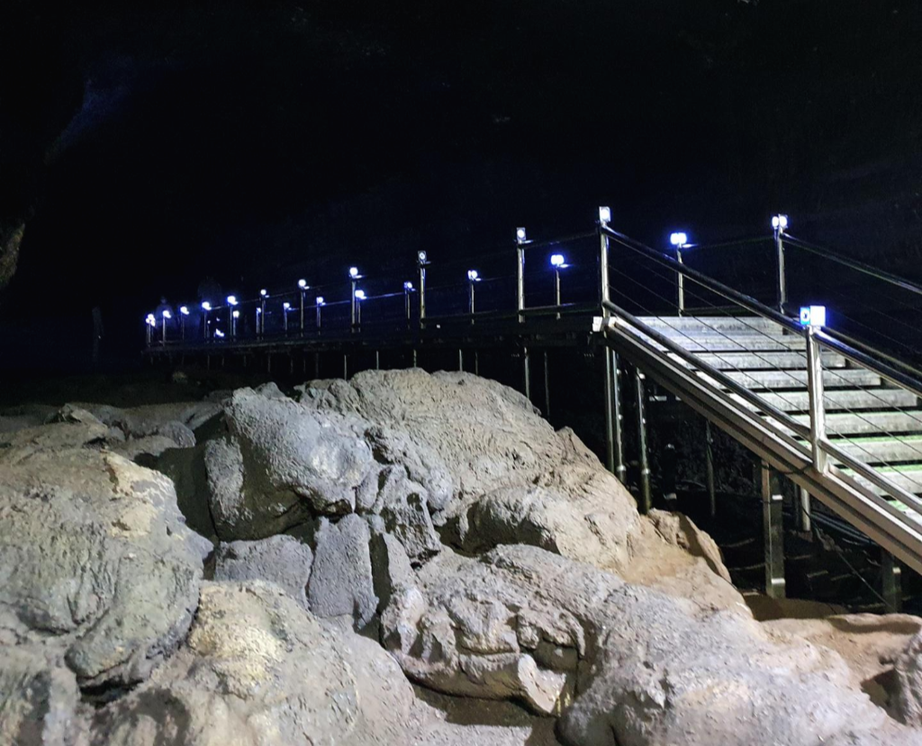 시원하고 큼직하게 뚫린 입구에서 계단을 따라 15m 정도 내려가다 보년 동굴 안에서 밀려오는 어둡고 찬 공기가 진하게 폐부를 찌르는데요, 연중 평균 기온이 12도 안팎을 유지하는 굴의 내부는 매우 깊어 빛과 소음을 싫어하는 박쥐들에게 좋은 서식처가 되고 있답니다.