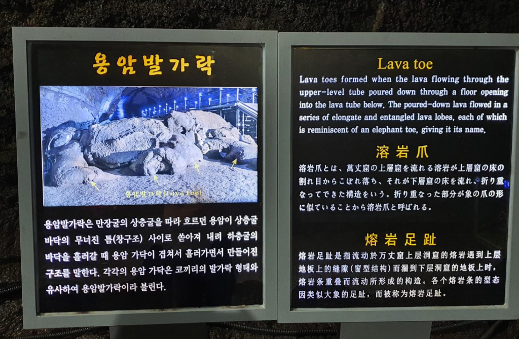 용암발가락은 만장굴의 상층 굴을 따라 흐르던 용암이 상층굴 바닥이 무너진 틈사이로 쏟아져내려 하층굴의 바닥을 흘러갈때 용암가닥이 겹쳐서 흘러가면서 만들어진 구조를 말한다고 합니다.