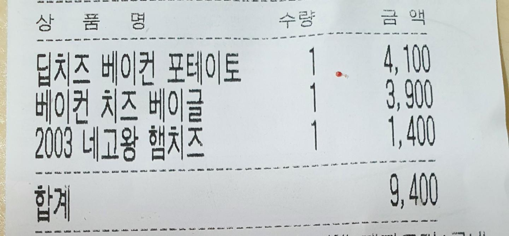 이벤트 진행하고 있는 2003 네고왕 햄치즈랑 베이컨 치즈 베이글이랑 딥치즈 베이컨 포테이토를 각각 하나씩 주문했습니다.