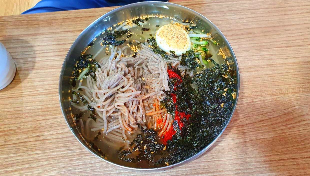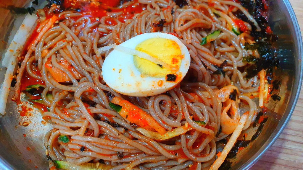 비빔메밀국수는 정말 소스가 맛있습니다. 알맞게 매콤하면서 감칠맛이 나는게 메밀국수와 조화를 이뤄 언제 먹어도 변함없이 맛있습니다.