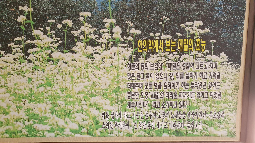 허준의 동의보감에 메밀은 성질이 고르고 차며 맛은 달고 독이 없으니 장, 위를 실하게 하고 기운을 돋우며 오장의 노폐물을 배출 시킨다고 합니다.